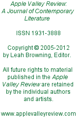 Apple Valley Review: A Journal of Contemporary Literature ISSN 1931-3888 Copyright © 2005-2012 by Leah Browning, Editor. All future rights to material published in the Apple Valley Review are retained by the individual authors and artists. www.applevalleyreview.com |
